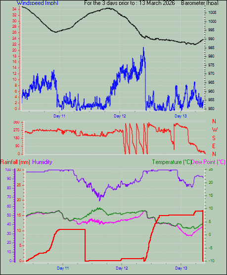 | Maximum Gust (since 9am) | 10.9 mph at: 10:00 | Maximum 1 minute average (since 9am) | 8.7 mph at: 15:41 |